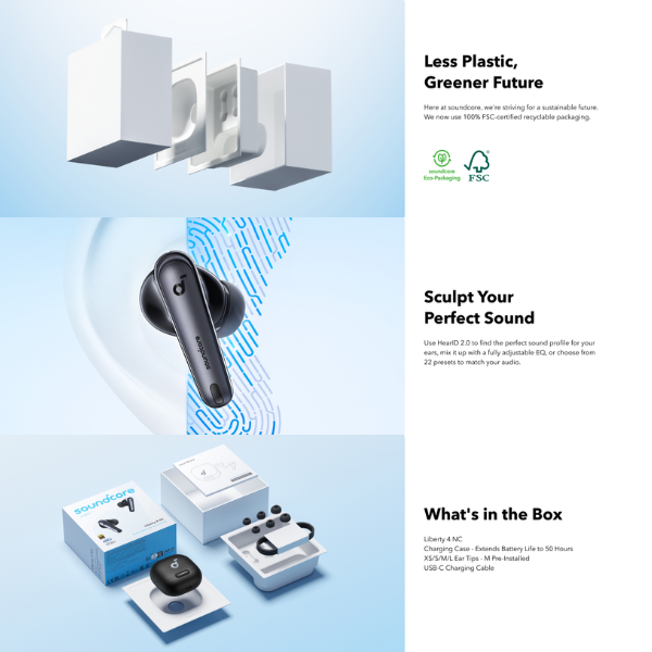 | Sales Package | Liberty 4 NC Earbuds, Charging Case, XS/S/M/L Ear Tips – M Pre-Installed, USB-C Charging Cable |