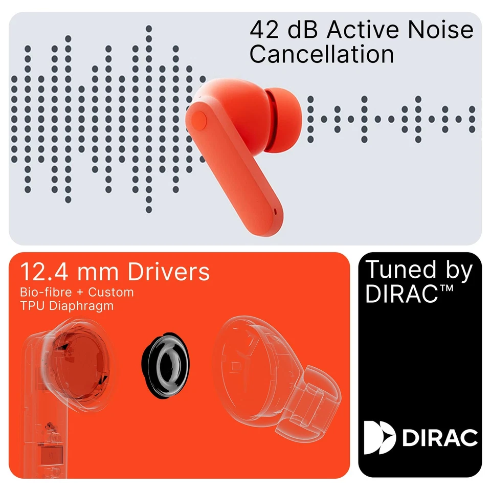 - Noise Cancellation: 42 dB Active Noise Cancellation (ANC), with Transparency Mode