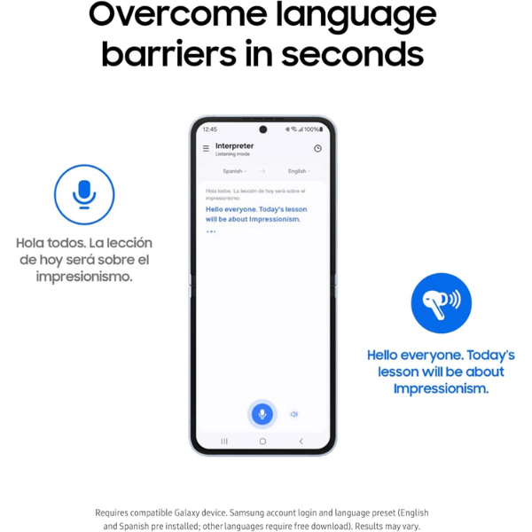 • Real-Time Translator: Translates face-to-face conversations using Real-Time Interpreter and Samsung Phone app integration.