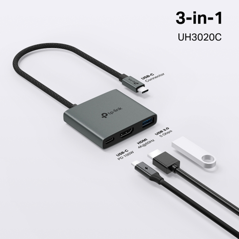 3 in 1 USB-C Hub: UH3020C turns a single USB-C port into 3 ports with a 4K@60Hz HDMI, 100W Power Delivery, 1× USB-A Data Ports.