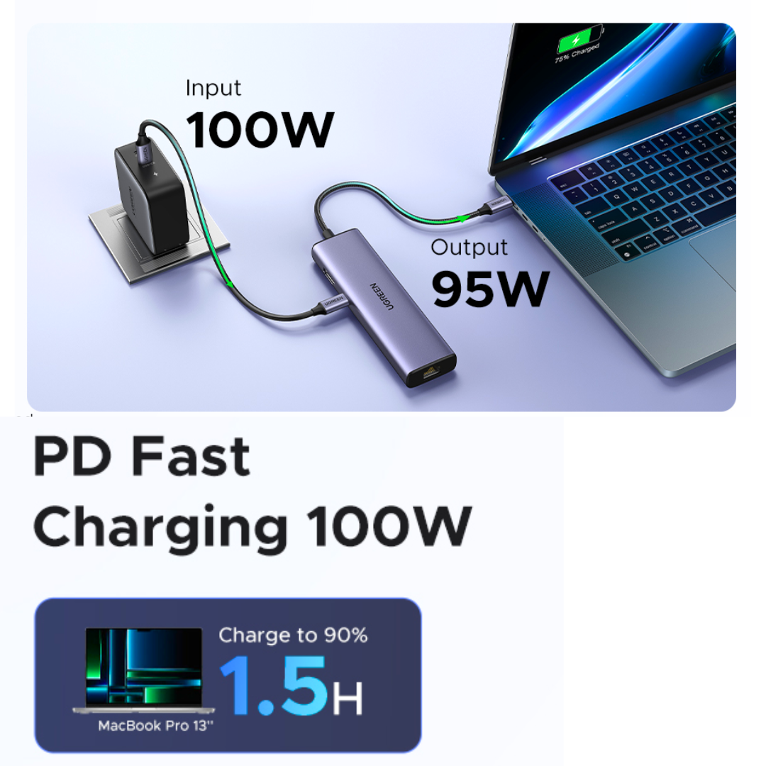 • PD 100W Fast Charging: Support up to 85W USB C pass-through charging via Type-C port to keep your laptop powered. 15W is reserved for other interface operations.Note: The USB-C port only supports charging and does not support data transmission or video output.